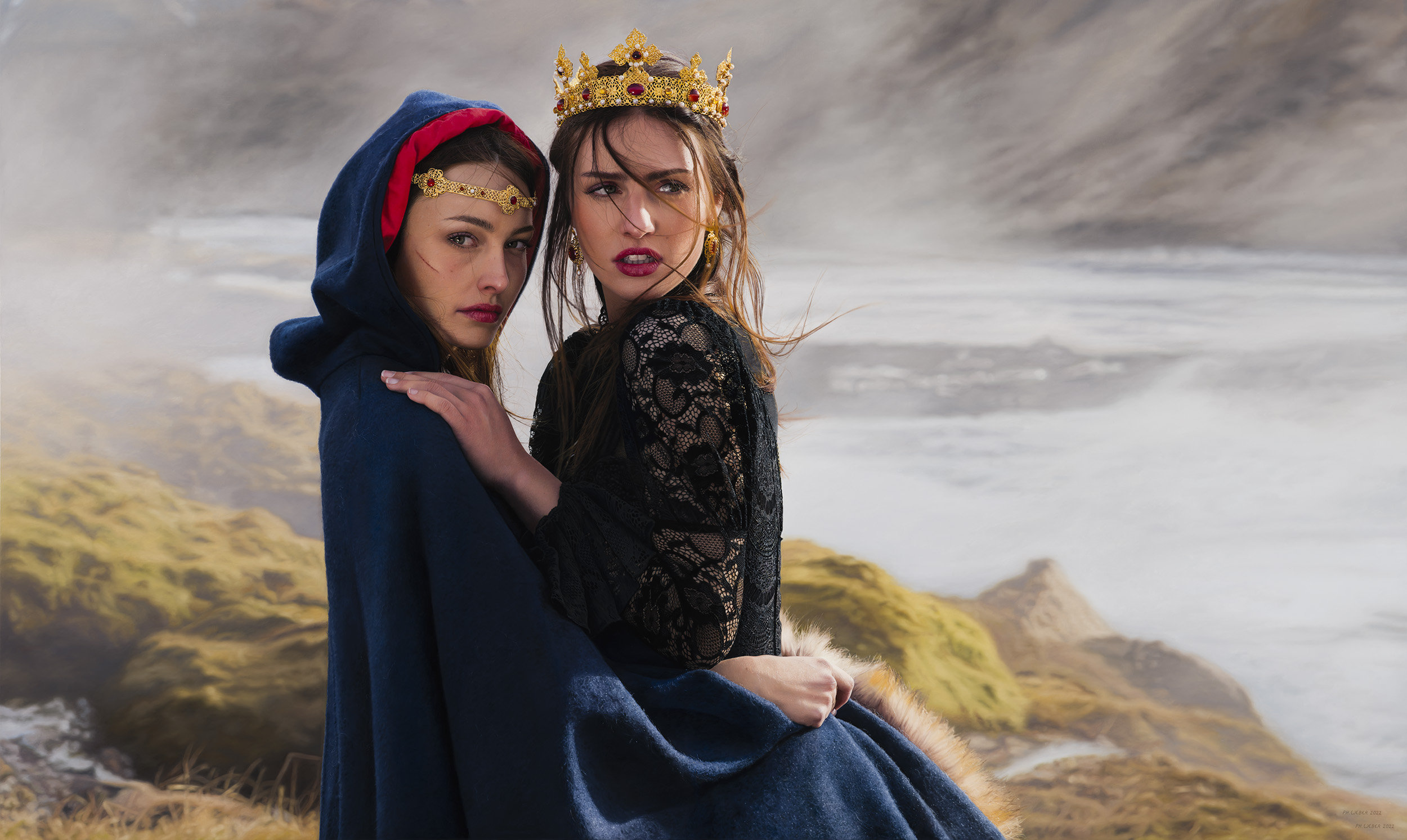 A Queen and her lady-in-waiting flee across Iceland’s stark, icy landscape. Stripped of comfort and certainty, the Queen appears vulnerable, yet she trusts the brave companion who leads her through danger. The Queen’s black dress suggests elegance and grief, while the lady-in-waiting’s blue cloak recalls the Madonna of Mercy, symbolizing protection. Their gold crowns signify power and light, while the rubies—stones of life and love—hint at both peril and healing.